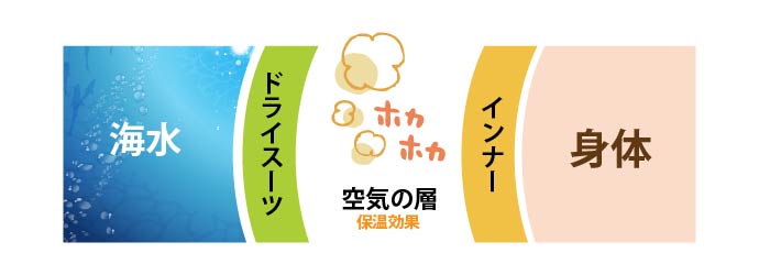 上図のように、水よりも熱伝導の低い空気の層を作ることで、体温の低下を防ぎ、保温力を維持することができます。